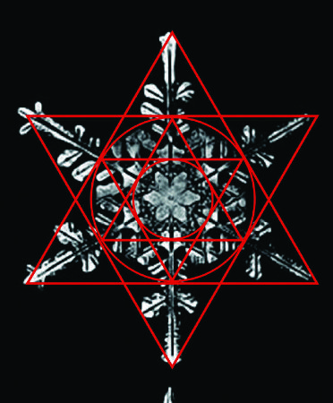 Hier sehen wir zwei Beispiele, eine Schneeflocke (Foto: Wilson A. Bentley 1902) und die Blüte einer wilden Rose. Der Aufbau der Form ist von verschachtelten Sechssternen bzw. einem Fünfstern bestimmt.