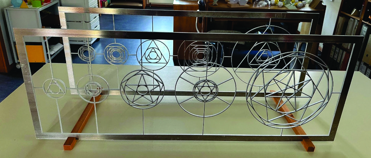 Für das zweite Sternengesetz gibt es bereits ein Modell, d.h. eine Realisation dessen, was in Vergrößerung in den Öffentlichen Raum kommen soll. Es besteht aus zwei Ebenen. In der vorderen sieht man die Sternfiguren bis zur Zahl Sieben (theoretisch erweiterbar bis in die Unendlichkeit), ergänzt um Quadrat und Dreieck, welche in der Gesetzmäßigkeit die tragende Rolle spielen. Die hintere Ebene zeigt das Gesetz, man kann sagen, das „Rückgrat“ aus Dreiecken und Quadraten. Größter und kleinster Kreis der Figuren in den beiden Ebenen decken sich jeweils: